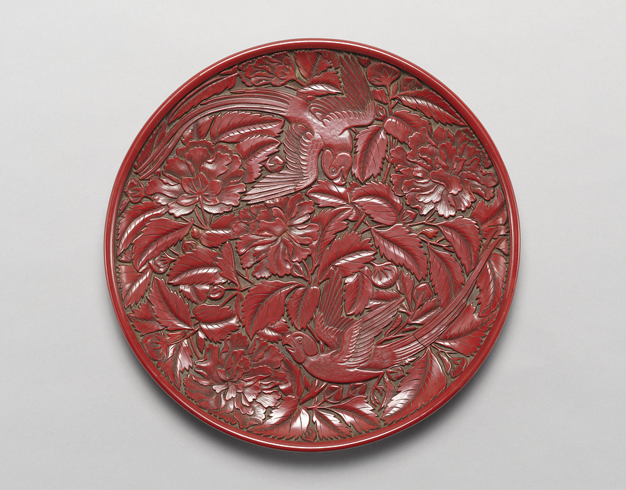漆を塗り重ねた層に文様を彫り表す彫漆の技法は、宋、元、明の時代に花開き、わが国にも本品のような盤が多数舶載され、唐物として珍重された。本品のような双鳥様式の堆朱盤は、唐物漆器の中でも定番であり、作行、状態ともに大変よい貴重な作例である。