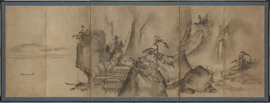 水辺の景観のなかに紅梅と涼をとる高士が描かれる。本図は春夏の情景を題材としており、当初は四季山水図屏風(6曲1双)の右隻であったと考えられる。画面に落款や印章はないが、幹が真っすぐ伸びる車輪松や、幹が弧を描いて伸び点描で葉を表わす竹の描写、全体的に整理された平明な構成から、筆者は唐招提寺総持坊に住した律僧で奈良法眼と呼ばれた鑑貞と考えられる。鑑貞は足利将軍家の御用絵師・周文に学ぶと伝えられ、この屏風絵は樹木や岩塊の表現に彼の周文学習の成果が具体的に示されている。本図は、室町時代に活躍した水墨画家・鑑貞の唯一の大画面絵画として貴重であり、また約10件のみが現存する室町水墨画の周文系山水図屏風の1つとして大きな意義をもつ。