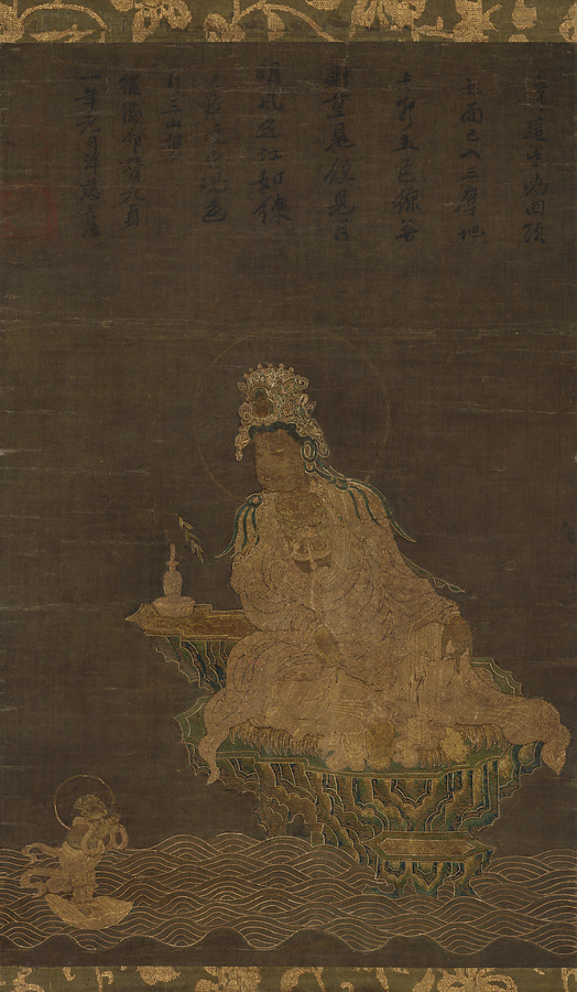 楊柳観音像と善財(ぜんざい)童子を繍いあらわした1幅。上方に元僧愚極智慧(ぐごくちえ)による元貞元年(1295)の賛があって、作られた時期が推定されるのが重要である。中国の刺繍は宋から元へと次第に粗荒になるとされるが、これはきわめて緻密で、特に観音の全身を埋めつくす亀甲(きっこう)や麻(あさ)の葉(は)つなぎの入り組んだ金糸の駒繍(こまぬ)いは、見る者を圧倒するような旺盛さをしめし、他に類例を見ないところである。