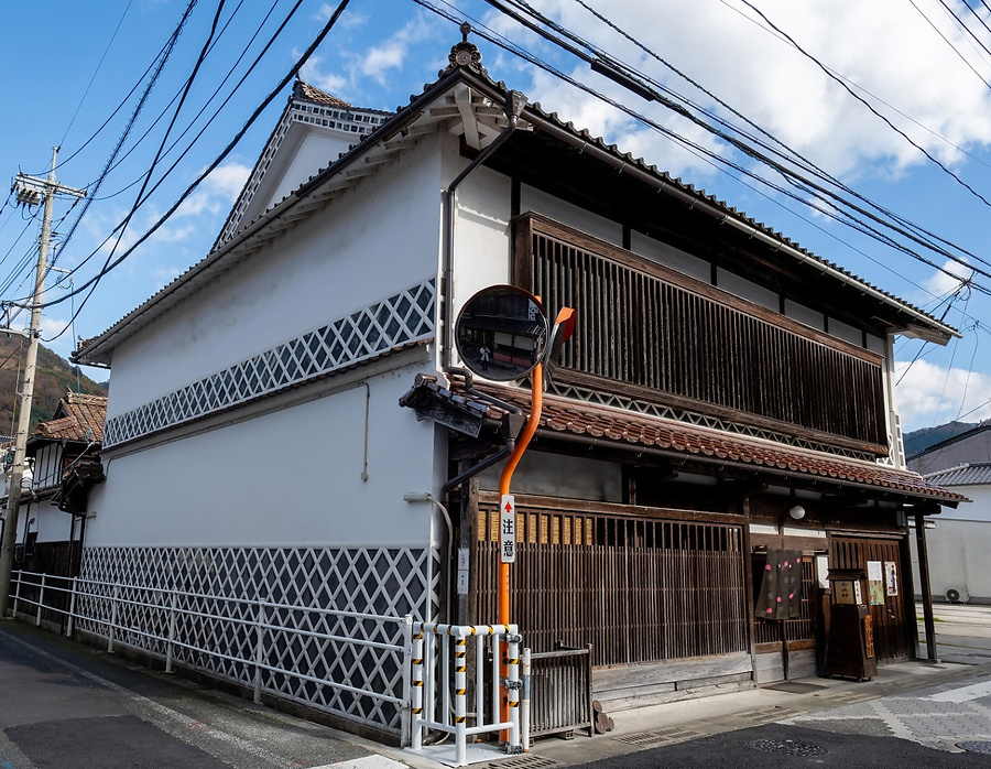 市街地中心部の角地に建つ旧呉服店の店舗兼主屋。二階建入母屋造平入桟瓦葺で北に座敷棟を接続。正面一階は平格子、二階は出格子構えで、西面は白漆喰塗大壁で各階腰を海鼠壁とする。内部一階南東部は土間で北西に座敷を配す。建ちが高く、豪壮な外観の町家。