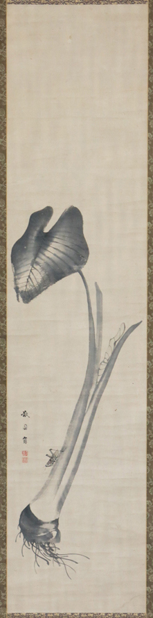 右幅には祠官(神職)が、左幅には大きな里芋の茎(ズイキ)に止まる蝗が描かれる。