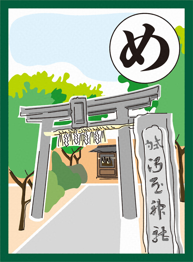 松原市の市制施行60周年を記念して発行された『まつばらいろはかるた』の47枚ある絵札のうち「め」の札。