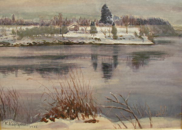 絵画 水彩 「冬の最上川」 加賀山鋼太郎