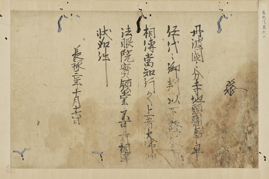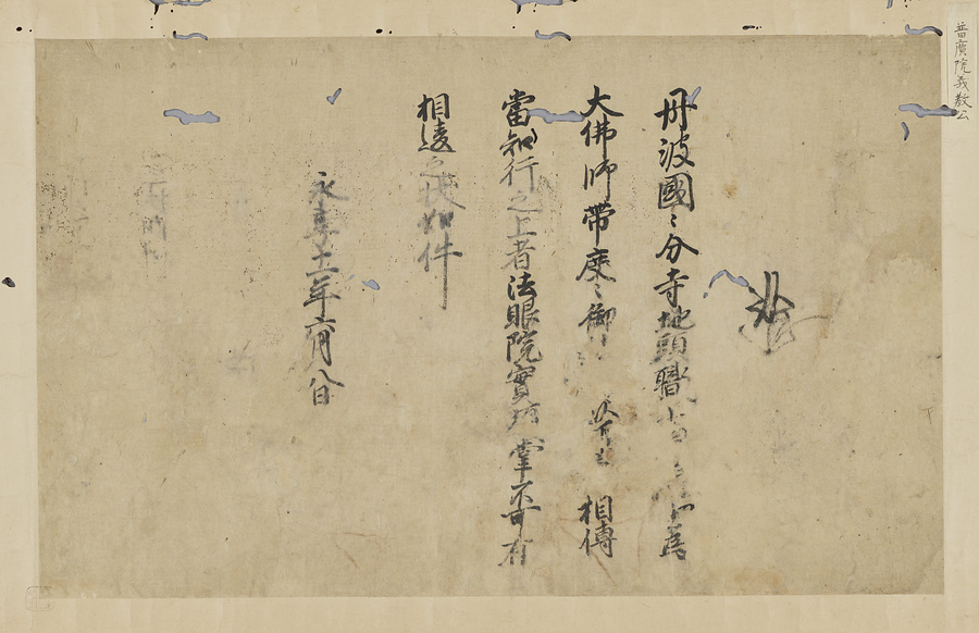 足利義満・義政などの将軍や管領を含む室町幕府関係者が、平安時代の定朝の流れをくむ院派の仏師に丹波国分寺地頭職を安堵した文書の正文(花押あり)12通と、院派傍系の仏師に将軍が仏像の製作を命じた文書の写し5通の計17通を成巻したもの。京都で書画の鑑定をよくした雨森善四郎(1793~1881)の旧蔵品。院派は14世紀以降、足利将軍家と緊密な関係を結んで活動したことが知られ、足利氏の菩提寺等持院の本尊造立料として院吉に与えられた丹波国分寺地頭職は、その後院広、院誉、院実と足利義政の時代まで継承された。南北朝~室町時代の仏師院派に関するまとまった史料群として貴重なもので、仏教美術史の観点からも重要な史料群である。