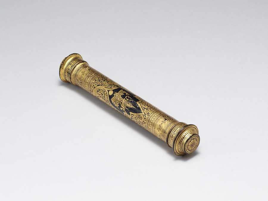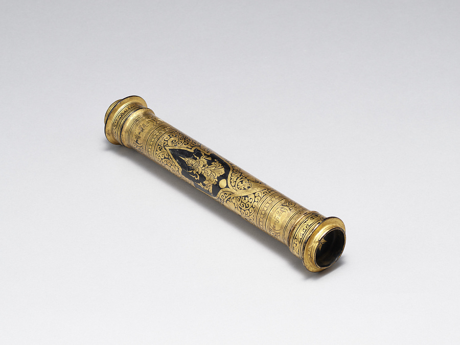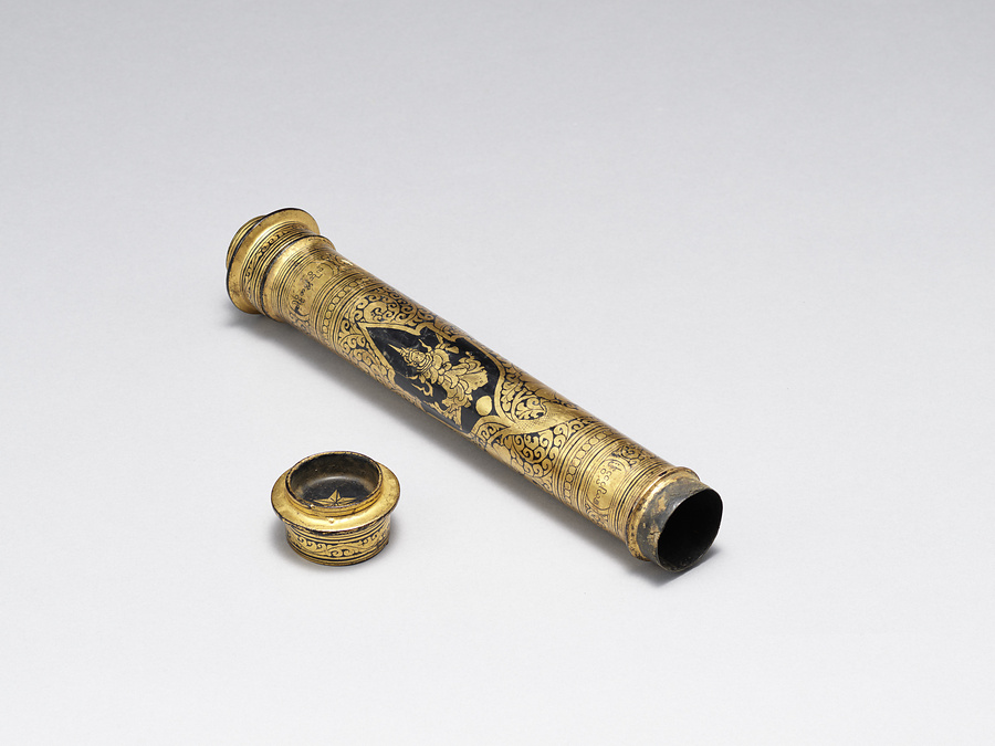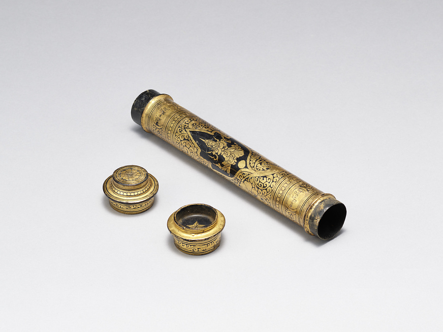 ミャンマーにおいて漆器は「ユン(yun)」と総称され、人びとの日々の生活や仏教などの宗教行事、建築空間における装飾などミャンマー社会に深く根付きながら多種多様に発展してきた工芸である。当地で作られる漆器の素地は、竹をはじめ木、馬毛、金属、布など様々であり、加飾技法も蒟醤や箔絵、下地盛り上げ、ガラス象嵌、漆絵、変わり塗、卵殻など多岐にわたる。主な漆工芸の産地としては、マンダレー管区のマンダレー市内のほかバガンやインワ、ザガイン管区のチャウッカ、シャン州のチャイントンやインレー湖周辺などがよく知られている。技法・意匠とも産地ごとに個性がみられるが、本品は器種・加飾技法ともにミャンマーの漆芸にみられる典型的な作例である。なお、収集者は本品を経筒としたが、用途はそれに限らず、パームリーフなどに書かれる貝葉文書を運搬・保管するための文箱として用いられたと考えられる。