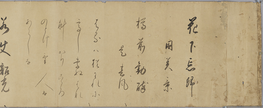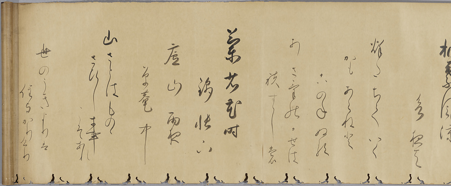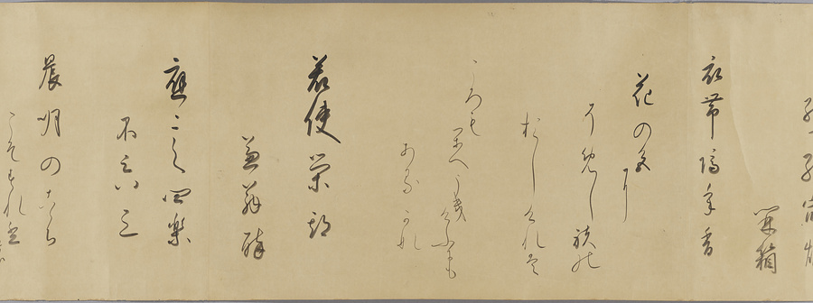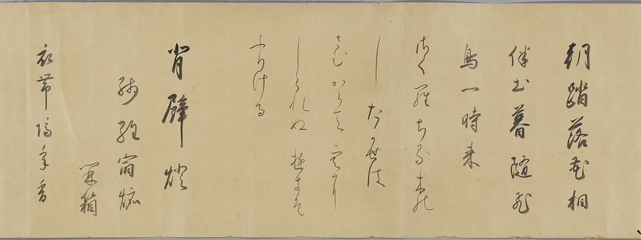 和漢朗詠集より漢詩と和歌を交互に8首ずつ(ただし漢詩は冒頭2句のみ)、全16首を抜き書きする。和漢朗詠集は平安時代中期、藤原公任(966-1041)の撰になる詩歌集。成立当初から、詩歌が必須の教養であった宮廷社会で人気を博し、美麗な調度手本が制作され、以降も長く古典として、また漢文の幼学書や書の手本として広く尊重された。江戸時代にも装飾料紙や素紙に、和漢朗詠集の一部を抜き書きした作例も複数確認される。本作品は書の手本として作成された書巻と考えられる。装飾性は無いが、光沢ある良質な料紙に、漢詩を行草書で、和歌を仮名で揮毫する。整った丁寧な筆致で、平滑な料紙により墨色の濃淡の変化が良好にうかがえる。