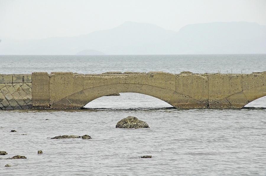 射場と陸地を結ぶために海中に築いた突堤。形状の異なるコンクリートブロックで積み上げた、長さ四五メートル、スパン八メートルの扁平な五連アーチ構造物。天端には二線の引込線跡を残す。コンクリートブロックを自在に成形して築いた独特な大規模構造物。