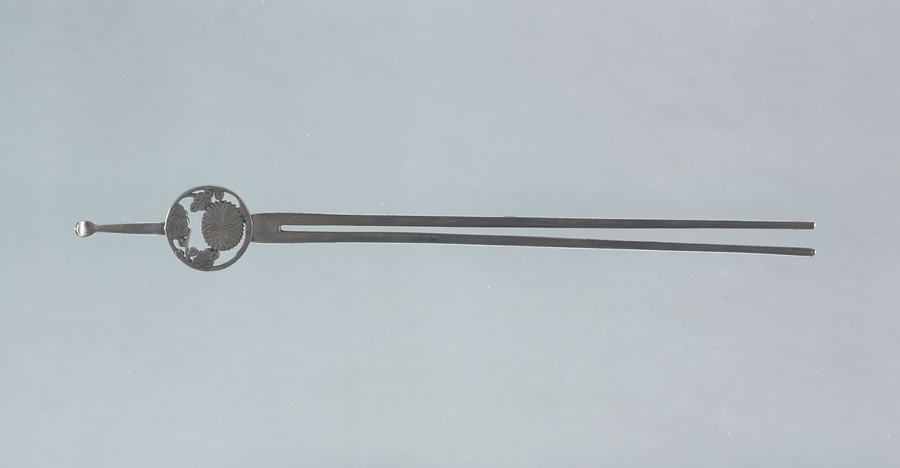 二本足の銀製簪で、梅に菊の丸文を表している。簪は笄から分化して発生し、二本足の簪は享保以降に出現した。延享元年(1744)に金銀製の櫛・笄が禁止されてからは象牙・鼈甲・錫が用いられたが、寛政頃から金銀製の簪が再流行した。花柳章太郎(1894~1965)の旧蔵品で平成15年(2003)に遺族の青山久仁子氏より国立劇場へ寄贈された。