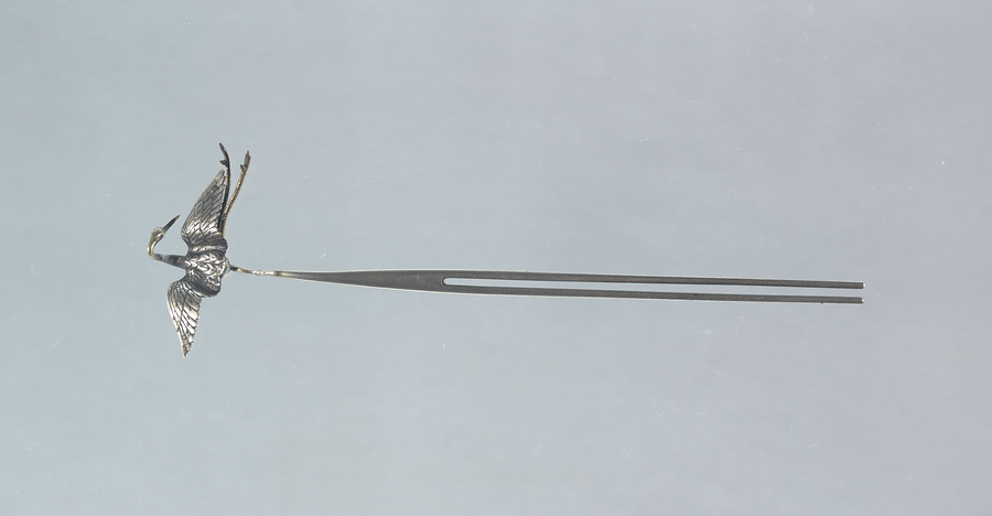 銀製、二本足の簪。先に鶴の容彫の飾りを付け、鶴の頭部と足部を金色絵としている。鶴は胴部と足が揺れで可動する。簪は笄から分化して発生し、二本足の簪は享保以降に出現した。延享元年(1744)に金銀製の櫛・笄が禁止されてからは象牙・鼈甲・錫が用いられたが、寛政頃から金銀製の簪が再流行した。花柳章太郎(1894~1965)の旧蔵品で平成15年(2003)に遺族の青山久仁子氏より国立劇場へ寄贈された。