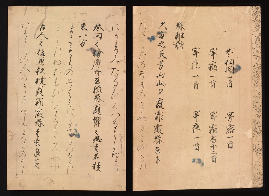 また紙自体も美しいもので、飛雲という紫と藍で染めた紙の繊維をすき込んだ鳥の子紙を用いています。