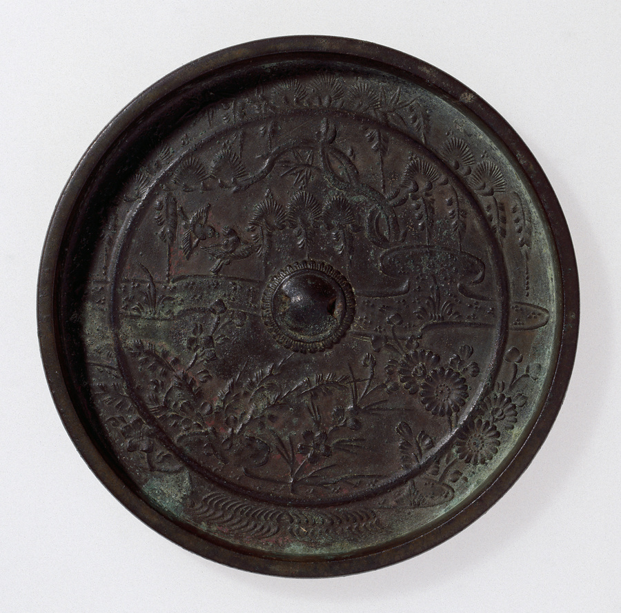 松藤文は「山高み松にかゝれる藤の花 そらより落つる波かとぞ見る」(『新拾遺和歌集』巻二)の歌のように、藤を波に見立て松にかかる情景を意匠化したものである。もし本鏡図様を案出した工人が「藤波」を意識したとすれば、一見無理な意匠構成に見える画面も、松波を背景に州浜と秋草の叢が展開するというすこぶつ立体的な構成として見直すことができる。