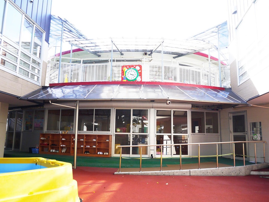 蕨市の市街地南東に位置する幼稚園舎。鉄筋コンクリート造二階建の円形平面で北側に玄関を開き、一階は中央遊戯室の周りに扇形の保育室を配す。二階は一階より一回り小さく、外周を屋上テラスとする。狭隘敷地で採光を考慮した坂本鹿名夫による巧みな園舎。