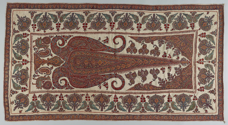 カシミヤ・ショールの人気が高まると、イランでも模倣【もほう】製作が行われるようになり、効率よくつくるため技法も簡略化されました。この作品は綴織【つづれおり】のかわりに、全面に刺繡を施しています。ミフラーブを象【かたど】っていることから、祈祷用の掛物として用いられたのでしょう。