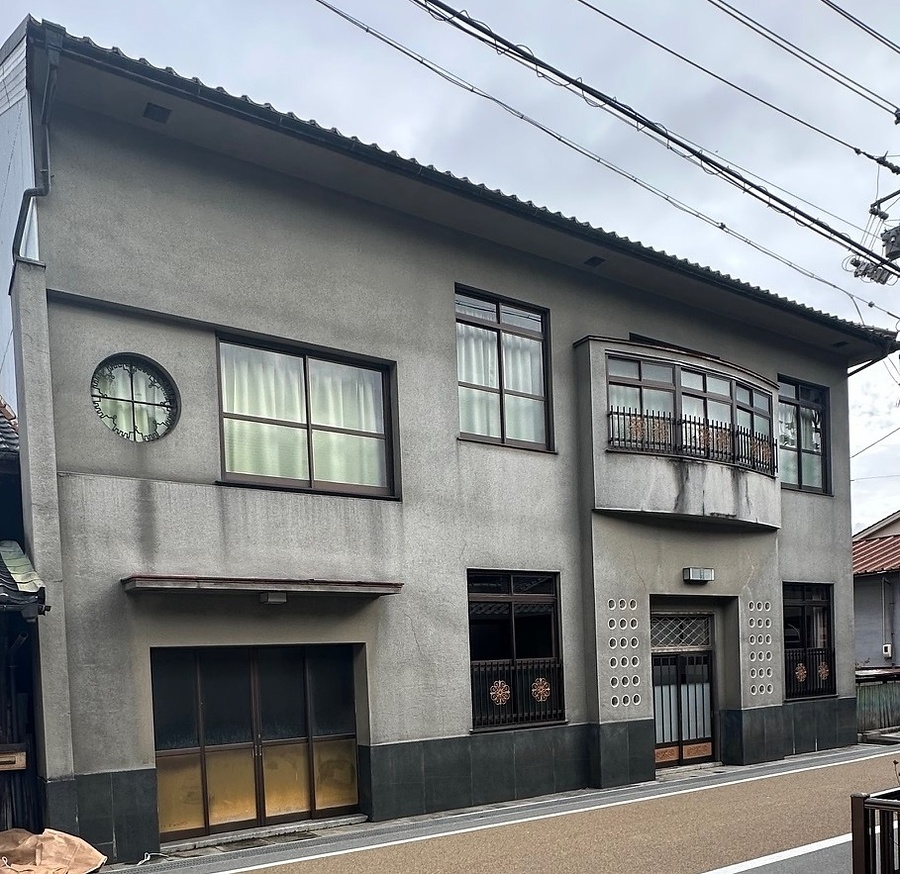 東城の新町筋に西面して建つ削岩機製造会社の事務所兼主屋。2階建片寄棟造桟瓦葺で外壁モルタル掻落仕上、腰を石貼。二階に出窓を張出し、丸窓など幾何学的意匠で飾る。正面側は事務所に改修し、背面側に和室の居住部を残す。独特な外観が通りの景観を形成。