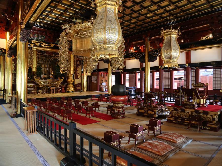本坊域の大本堂東に南面して建つ。いわゆる撞木造で、側廻りは二手先組物、妻飾は虹梁大瓶束に蟇股を加え向拝に軒唐破風を付す。宗祖六〇〇年遠忌の再建で、豪壮な外観や広大な中陣を含む深遠な内部、精緻な彫刻で飾る内陣など総本山としての威容を示す。