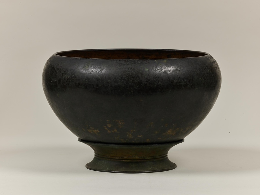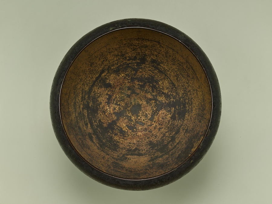 今回ご紹介する作品はそういった鉢の一つですが、かなり大ぶりです。実は、これは僧侶個人が使うものではなく、仏へ供物を捧げる器として用いられたものと考えられます。僧の持つ鉢は陶器もしくは鉄で作ると定められていますが、この鉢は銅でできています。さらに金メッキで装飾されていることからも、実用品ではなく、仏への供養に用いられた器であることが分かります。