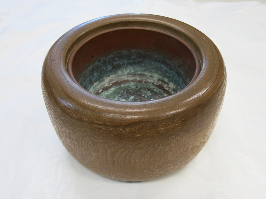 高岡市末広町通り(末広町39の現・SMBC日興証券高岡支店の前)にあった神木・七本杉の用材で作られた火鉢。大小2個セットで作られたもの。七本杉をくり抜いた中に落とし(金属部分)が嵌め込まれている。