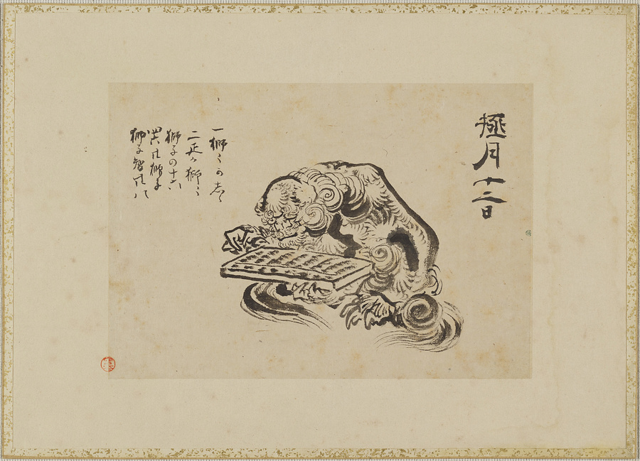 北斎は83歳を迎えた天保13年(1842)から翌14年にかけて、「日新たに魔を除く」ことを願い、ほぼ毎朝、獅子や獅子にゆかりのある人物などを日課として描いた。注文に応じて制作した作品とは異なり、画家本人が厄除けのために描くという非常にプライベートな性質の資料としても、極めて高い価値をもつ。半紙に表された小型の獅子図は、国内外のコレクションに点在し、そのなかでも九州国立博物館は219枚という最もまとまった数を収蔵する。これは、88歳になった北斎が信州松代藩士・宮本慎助に贈ったものとして知られる。なお、宮本氏に贈呈する際に北斎が付け加えた「宝珠図」や「長寿の薬法」も、北斎の遊び心をうかがわせる資料として興味深い。