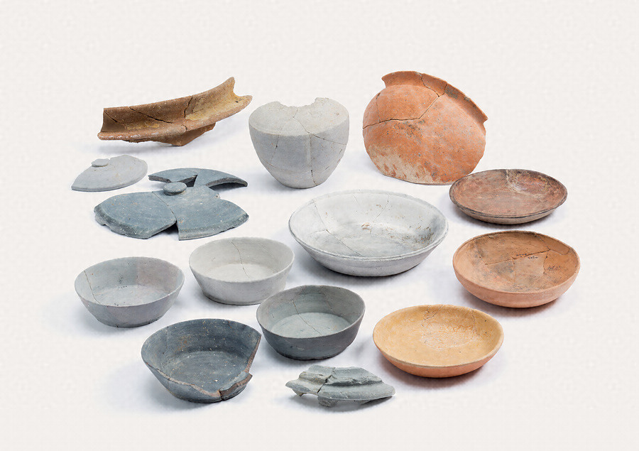 松原市立学校給食センターの建設に伴う河合遺跡の発掘調査(調査番号:C6-3-14)で、落ち込み(SX2019)から出土した奈良時代から平安時代にかけての須恵器と土師器。この調査で確認された官衙建物(長舎)の廃絶後に落ち込みへ土器が廃棄されたと考えられる。