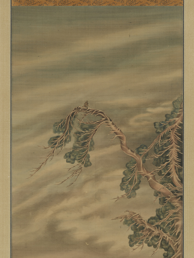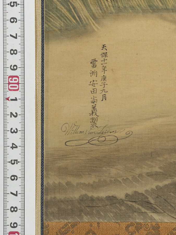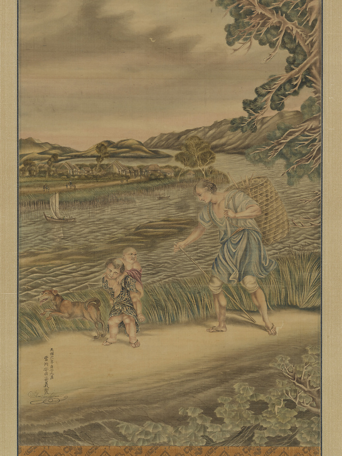 前景に竹籠を背負う男性、赤児を負ぶった子どもと犬、川を挟んだ遠景には透視図法(線遠近法)を取り入れた村落と山並みを表わす。雲のかかった空を画面上半分に広々と表わし、画面右の高く枝を張った樹木に一羽の鳥が留まる。その表現には刻線(ハッチング、クロスハッチング)を模した平行線や交差する線が見られるなど、西洋銅版画学習の痕跡が顕著である。落款「天保十一年庚子九月 雷洲安田尚義製」「Willem Van Leiden」により、安田雷洲(?-1859)の円熟期の作例、かつ細緻な描き込みから画家の代表作と位置付けられるものである。