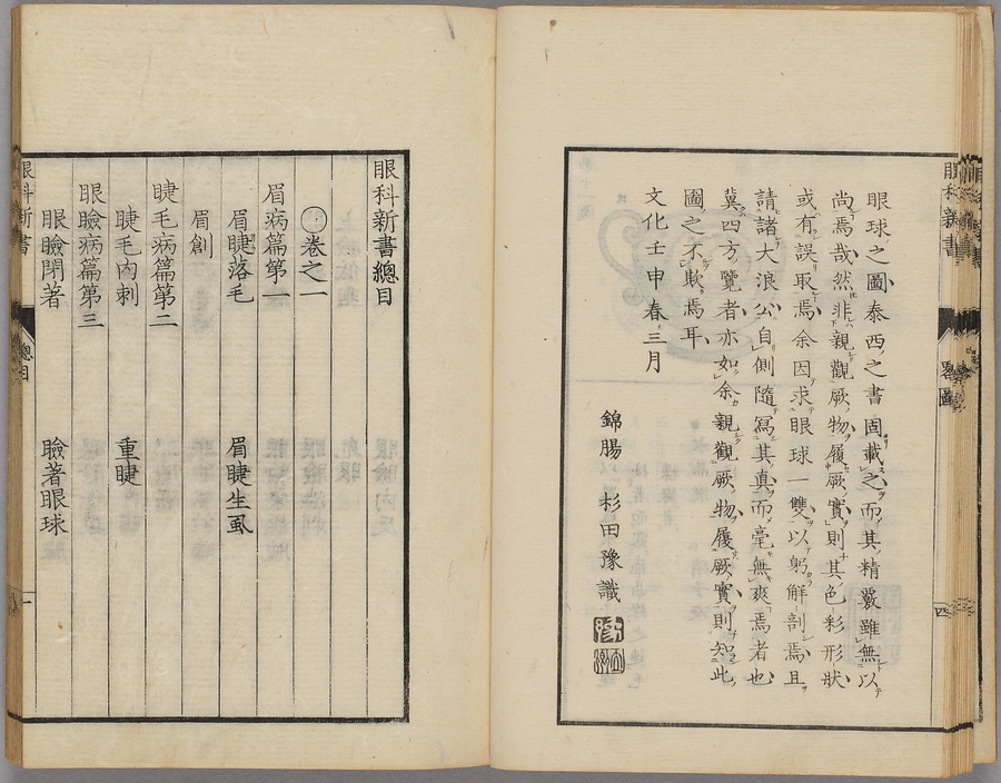 オーストリア・ウィーンの医師ヨゼフ・プレンク(Joseph Jacob Plenck, 1735-1807)が著した"Doctrina de Morbis Oculorum"(1777年初版、ラテン語版)を、オランダ・ロッテルダムのプロイス(Martinus Pruys, 1752-1830)が蘭語訳した"Verhandeling over de Oogziekten"(1778年初版)を、さらに重訳した和訳本である。本書は、杉田立卿(1786-1846)が翻訳した巻一から巻五と、その門人である松田芹斎が編集した付録からなる。全体で118の病例を解説したもので、巻一には石川大浪(1765-1817)の描いた眼球略図(全11図)や、巻五巻末には大槻玄沢(1757-1827)の跋が収められる。西洋の本格的な眼科学を日本に広めた書として高く評価される。