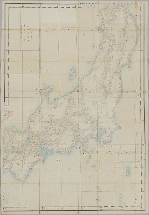 本図は、慶応3年に刊行した時と同じ版木を用いて、明治3年(1870)に大学南校が刊行した再版図である。地図行政は民部省地理司が掌ることになったが、近代的測量法に基づく「輯製二十万分一図」の製作開始は明治17年まで待たなければならなかった。維新後、明治政府は対内的・対外的に国土基本図たる地図が必要であるものの、「伊能図」の水準を超える地図製作は困難な状況であり、再版したと推測される。