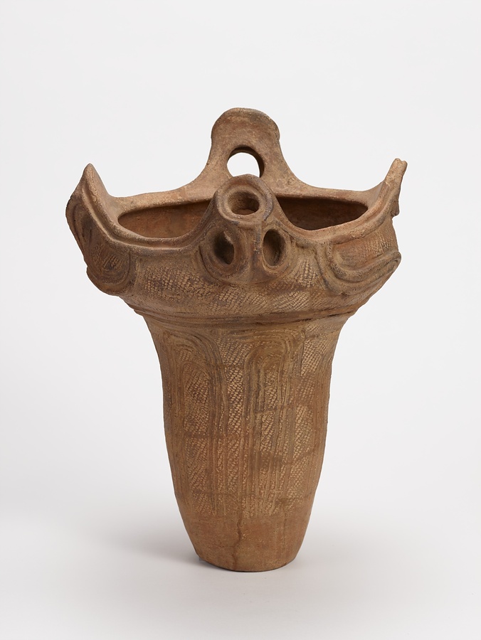 縄文時代中期の東関東地方を中心に分布する土器。口縁部に取り付けられた複数の環状の透かしを持つ4つの把手による装飾が特徴的である。この時期の日本列島では、新潟の火焔型土器をはじめとする口縁部が過剰に装飾された土器が各地で流行した。本品は、その地域性を知る上で貴重である。
