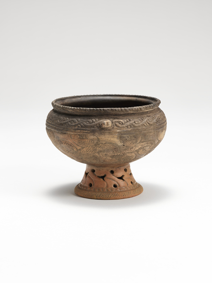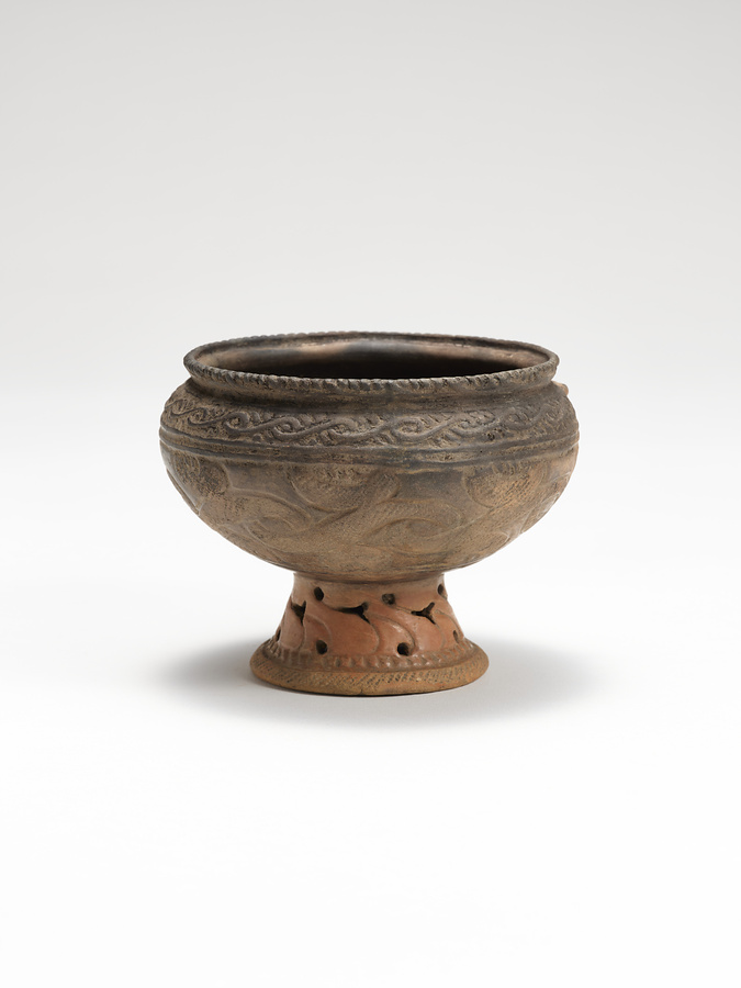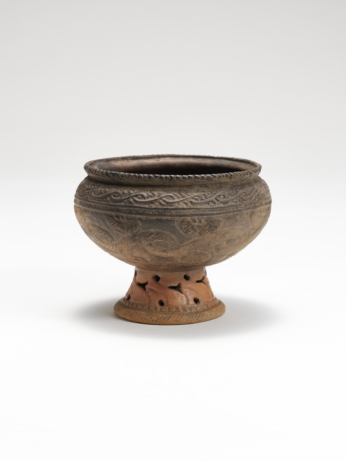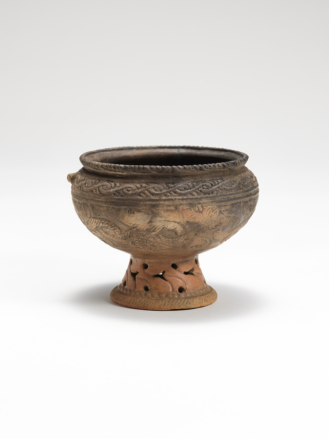 縄文時代晩期の東北から北海道南西部にかけて出土する亀ヶ岡文化の土器である。胴部を一部欠失するものの、均整のとれた器形、薄作り器壁、台部の透し、精緻な入組文と羊歯状文が特徴的である。亀ヶ岡文化では、工芸技術や祭祀が発達し、精巧な造りの土器、土製や石製の祭祀具が多数生産されたが、本品はその特質をよく示す作例である。