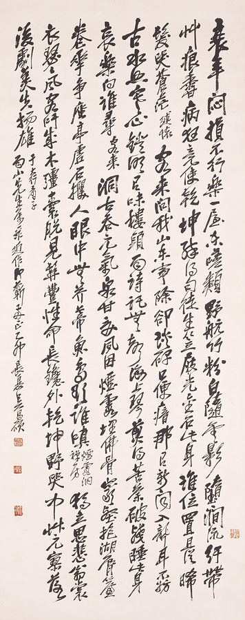 呉昌碩(ごしょうせき:1844~1927)は、浙江省安吉の人。名は俊卿。字は倉石、のち昌碩と改めた。代々文学の家がらで詩をよくし、篆刻に長じ、また画をたくみにした。久しく蘇州に住したが、辛亥革命ののち上海に閉居した。日本の書家長尾雨山は一時期上海に住んでおり、その間、呉昌碩と知りあったものと考えられ、これらの作品はその交友によって長尾家にもたらされたものと考えられる。