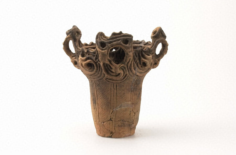 縄文時代中期の深鉢で、橋状の取っ手の他に口縁部に馬高系の影響を受けた装飾が施されている。