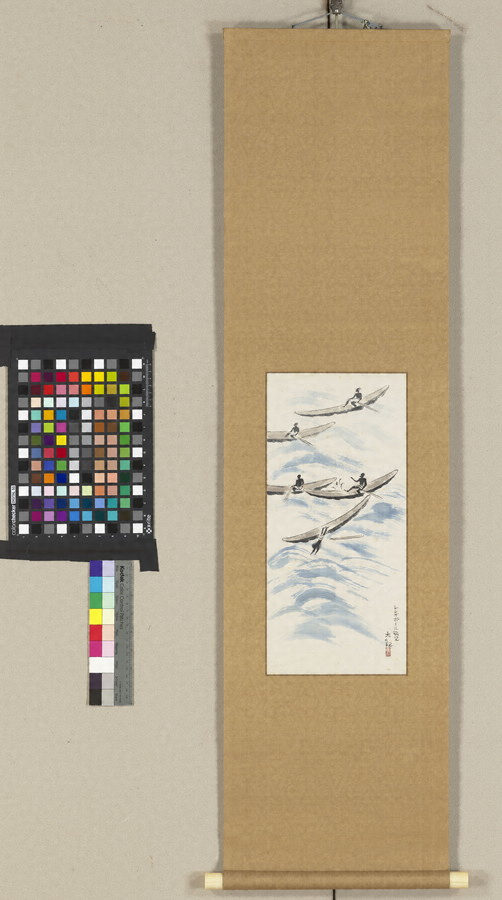 昭和5年、大観は、ローマでの日本美術展開催にあたりイタリアに赴いた。この作品は、その渡航時、シンガポールに寄港した際に見た光景を描いたものである。船の乗客が放ったコインを、海中にもぐって拾う現地の少年たちの姿が、当時乗客たちの興味をひいたという。小品ながら、水墨の軽妙な筆づかいで人物の動きが捉えられた、旅の記念ともいえる作品である。