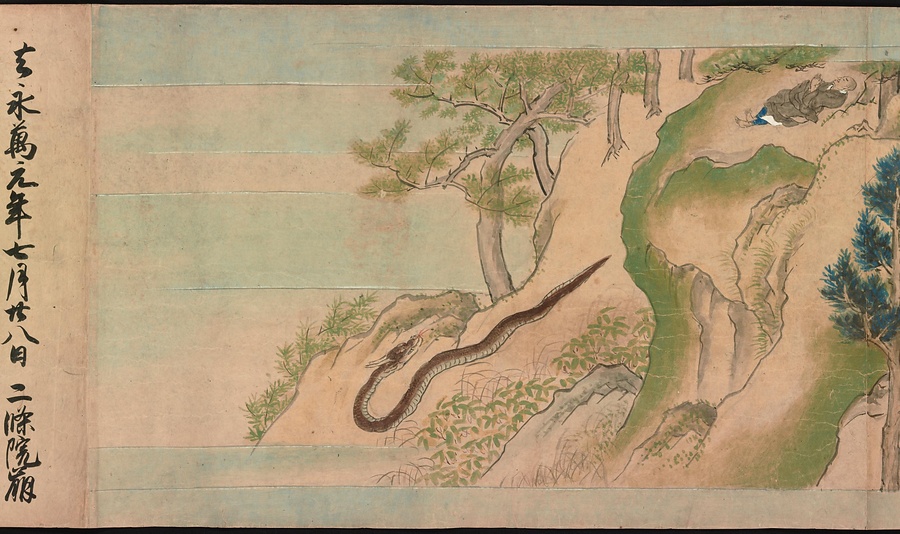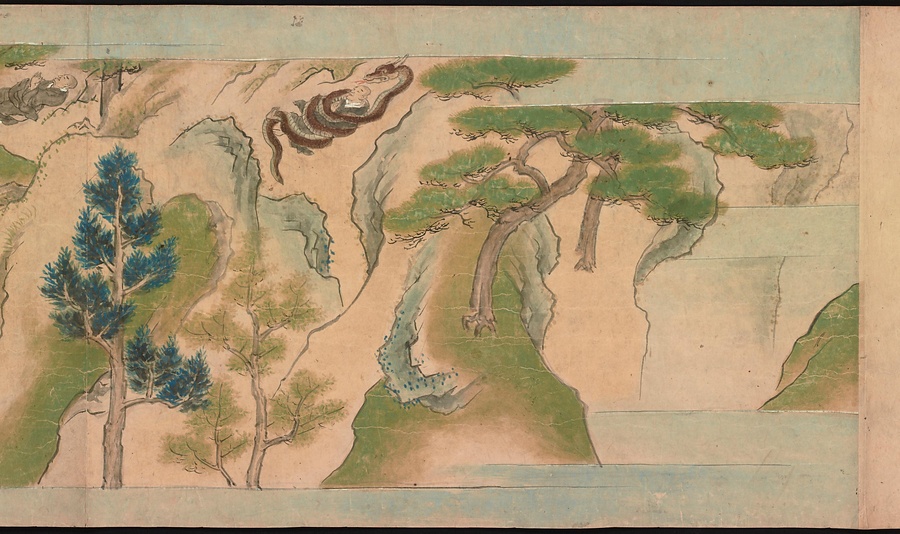 最初の場面は、清水寺の僧兼慶(けんけい)が信濃の国、現在の長野県を訪れたときのお話。大蛇にとらわれた兼慶が、清水寺の山門に仁王像(におうぞう)をつくって安置するという願をかけたところ大蛇は去っていきました。