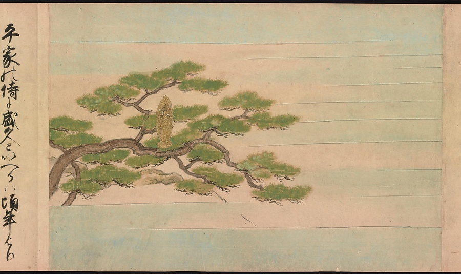 そのとき、ご本尊は自らお堂を飛んで出て、檜の木に飛び移り無事でした。そのシーンが描かれているのが3番目の絵です。