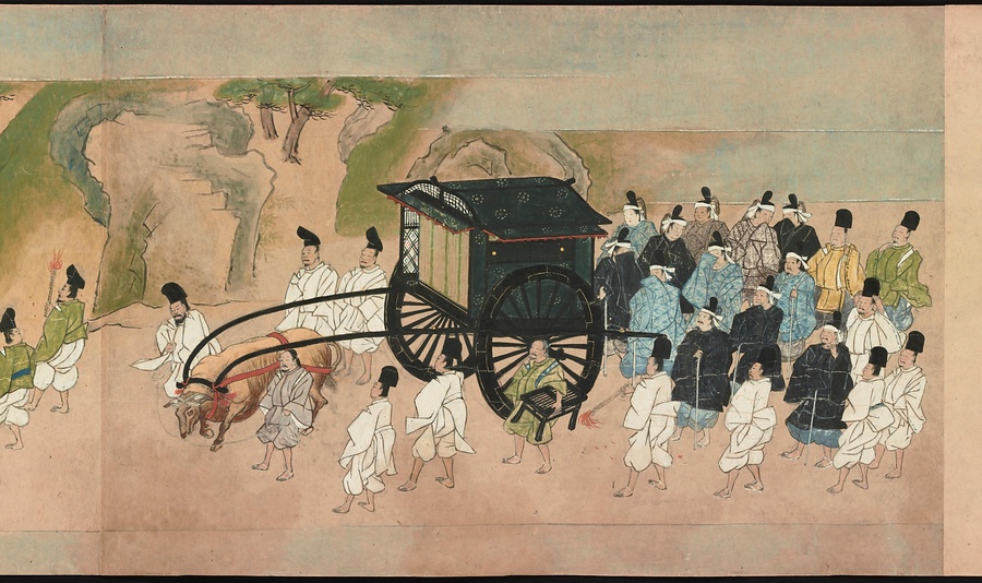 次は、平安時代の二条天皇の葬儀の場面です。当時、大きな勢力を持っていた比叡山延暦寺(ひえいざんえんりゃくじ)と奈良の興福寺(こうふくじ)の僧たちが向き合っている様子を描いています。このときは、大きな混乱もなく無事葬儀を終えたものの、その年、比叡山の僧兵が押し寄せて寺に火を放ったというのです。