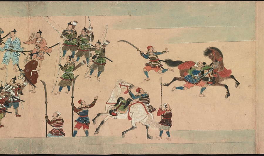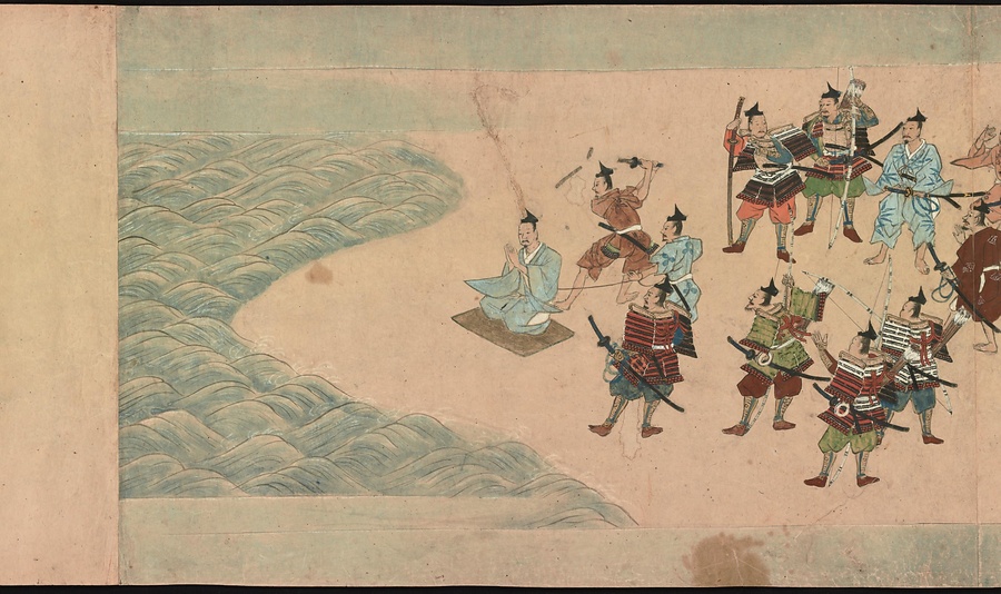4番目の絵は、平家の侍盛久(もりひさ)が、源氏方に捕らえられた場面です。清水寺への信仰が篤かった盛久は、ある夜夢のなかで年老いた僧から秘密の呪文を授かりました。