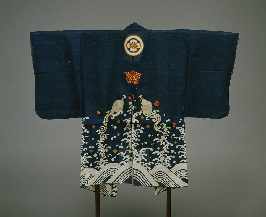 女性用の火事装束。麻地の単仕立てなので、夏用と考えられる。火事を避けるという縁起から、波に兎、龍など、水に関連する模様をデザインする。胸当・羽織の背にある木瓜紋や兎は切付(アップリケ)の後、輪郭を撚金糸でかがる。
