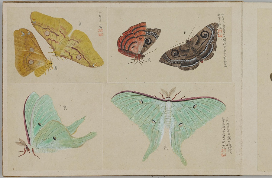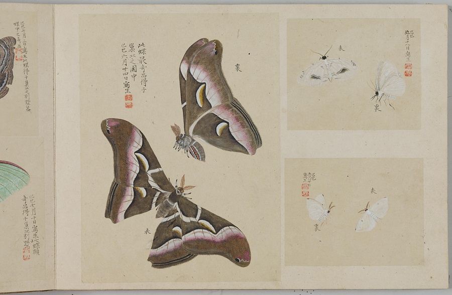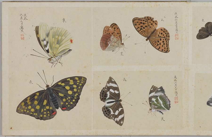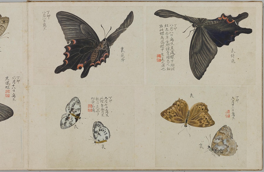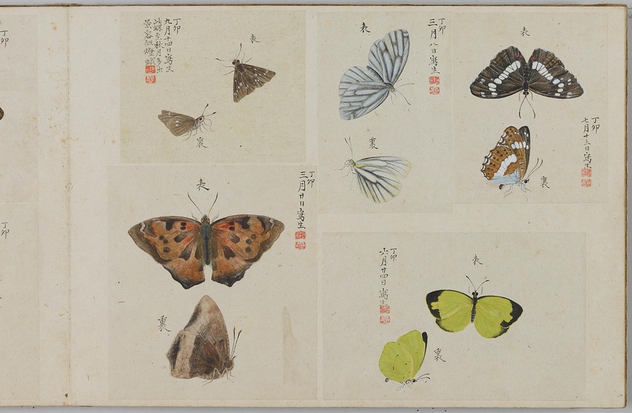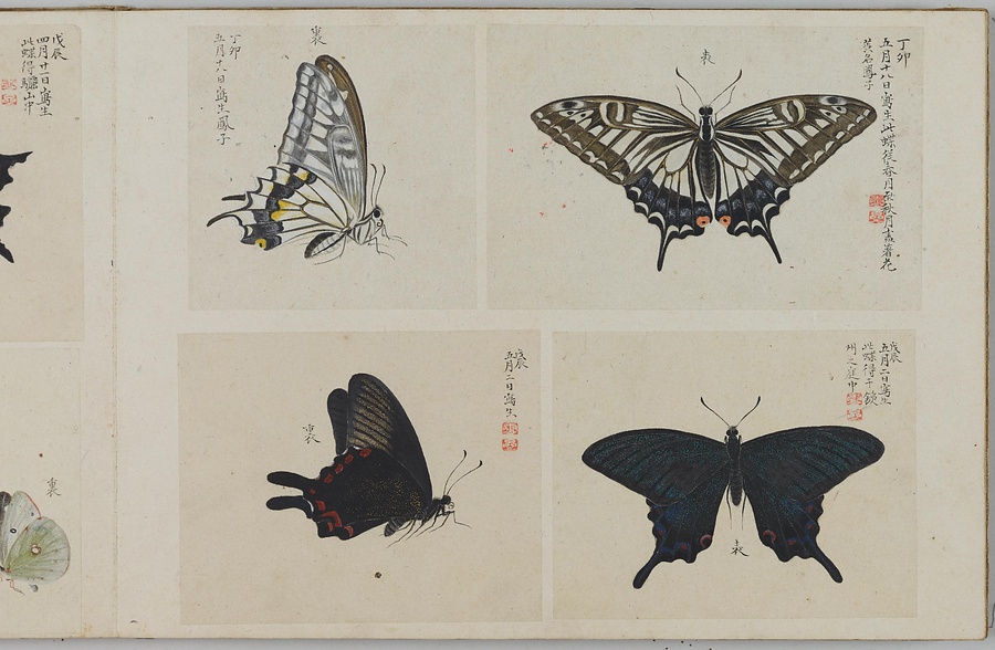 昆虫、は虫類、淡水魚など、さまざまな生物を描いた写生図を、生物の種別ごとにスクラップした画帖(がじょう)です。「虫」(ちゅう)とは小型生物のうち足のあるもの、「豸」(ち)とは足のないもののこと。つまり虫豸帖という題名は、さまざまな小型生物を集めた画帖を意味しています。画帖は春・夏・秋・冬の4冊に分かれ、春にはチョウ、夏にはトンボ・バッタ・セミ、秋にはガ・ハチ・イモムシ・カブトムシ、冬にはクモ・淡水魚・トカゲ、カエルなどが納められています。それぞれのページには、大きいもので1枚、小さいもので4枚ほどの写生図が貼られており、絵のそばには写生した日付や生物の名前、特徴などのメモも記されます。いずれの生物も、驚くほどリアルです。筆者が実際の生物を注意深く観察していたことはもちろんですが、透き通る羽やなめらかな肌などの質感や立体感を、それらしく表現できる絵画技術をもっていたからこそ、実現することができたのです。単なる写生にとどまらない絵画的な美しさ、楽しさも、大きな魅力といえるでしょう。