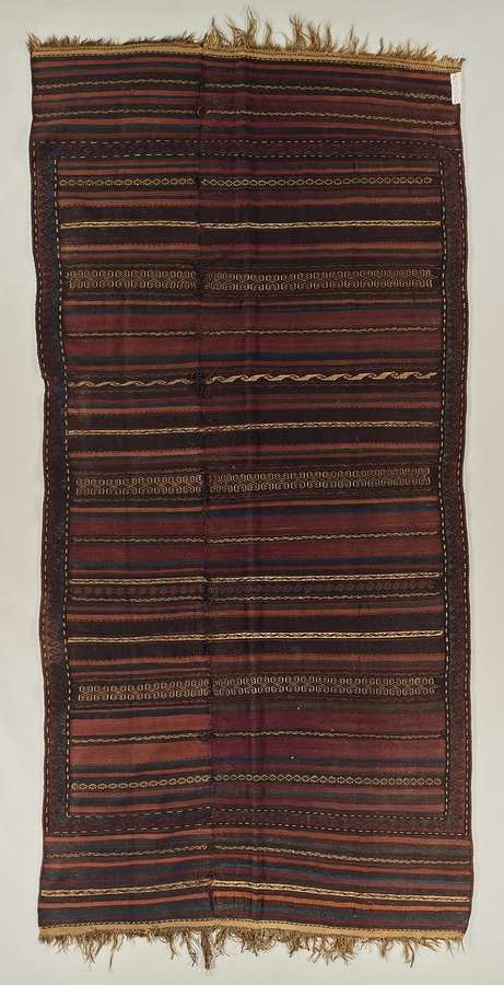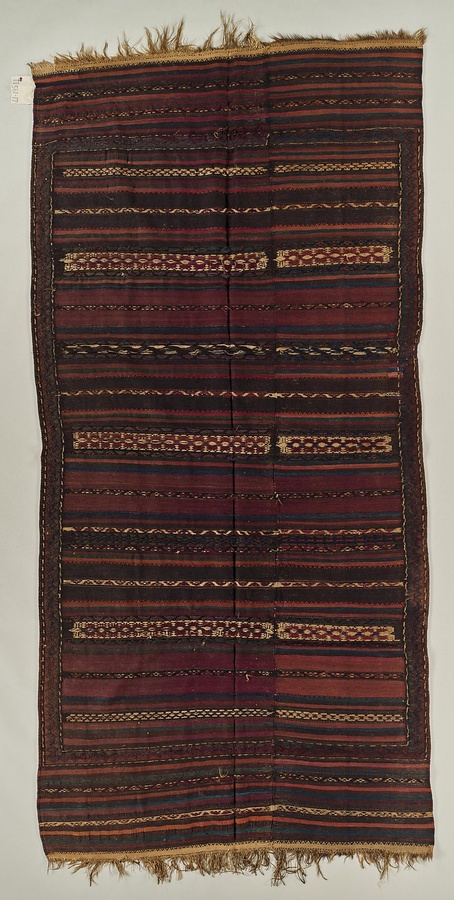 敷物 黒地段幾何文様綴織・スマック織・パイル織