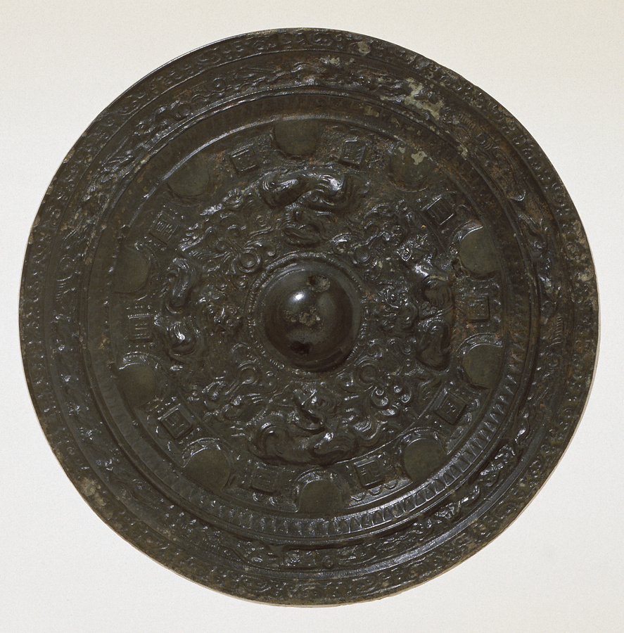 一般に鏡面(うつる面)はゆるい凸面で、水銀でていねいに磨かれる。背面にはいろいろな文様が表され、中央にひもを通すつまみ(鈕)がつけられる。鏡の展示ではもっぱら背面の文様を見せるのだが、ここでは鏡面を上にして置いた。