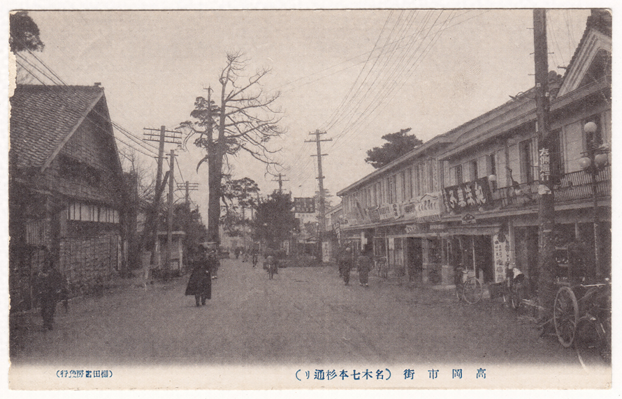高岡市末広町通りにあった七本杉を中心に駅方面を写した写真絵葉書。道路の右側には和洋菓子店の看板など、いくつかの商店が軒を連ねている。これらの店舗は木津太郎平邸跡で、七本杉伐採(昭和2年11月26日)の年に木津邸が後方に移動して造設されたものである。下部には青字で「高岡市街(名木七本杉通り)/棚田書房発行」とある。未使用。