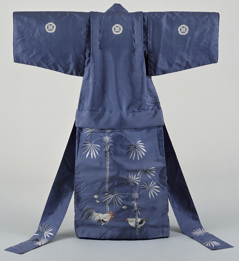 納戸地棕櫚に鶏文様着物