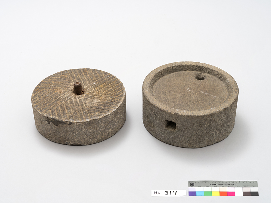 1.雑穀の粉ひきに用いた。昭和1年代までは毎朝アンブ(団子)が常食であった。2.雪さらしした糸をのばすときや、チギリ巻きに用いた。資料番号:5178(画像の資料)、5565、5566、5567