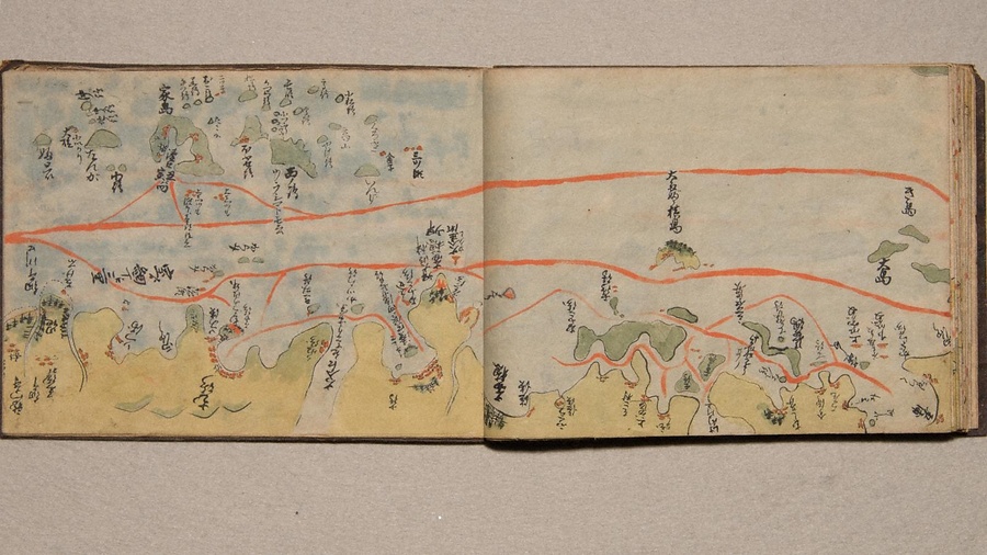 手書の海路図で、航路を朱線で記す。表紙に「平戸より大坂迄 懐中地図」と題箋に記された墨書があり、この外題を資料名とした。瀬戸内海の島々についての注記が特に詳細で、方角の記載は要所にあり、「懐中地図」の名のとおり、実用の海路図であったことをうかがわせる。