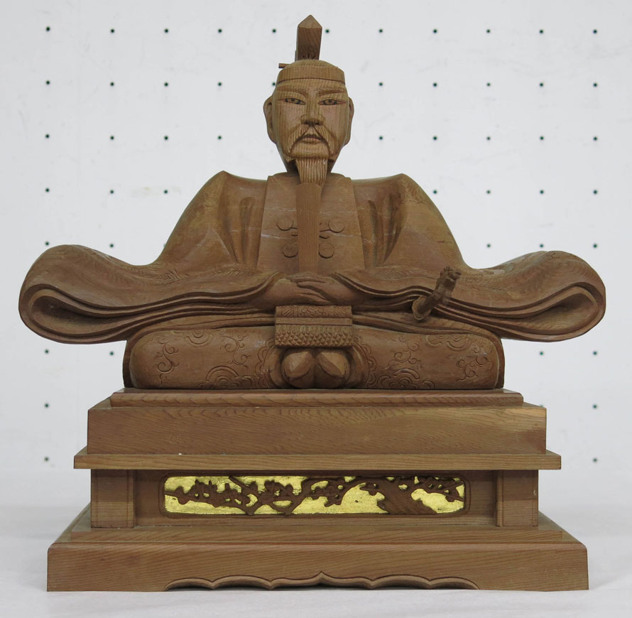 本体と台座は接着されている。首、刀(柄、鞘)、笏は取り外し可 。正面中段は梅文彫刻の背景に金箔押し 。井波彫刻と思われる。