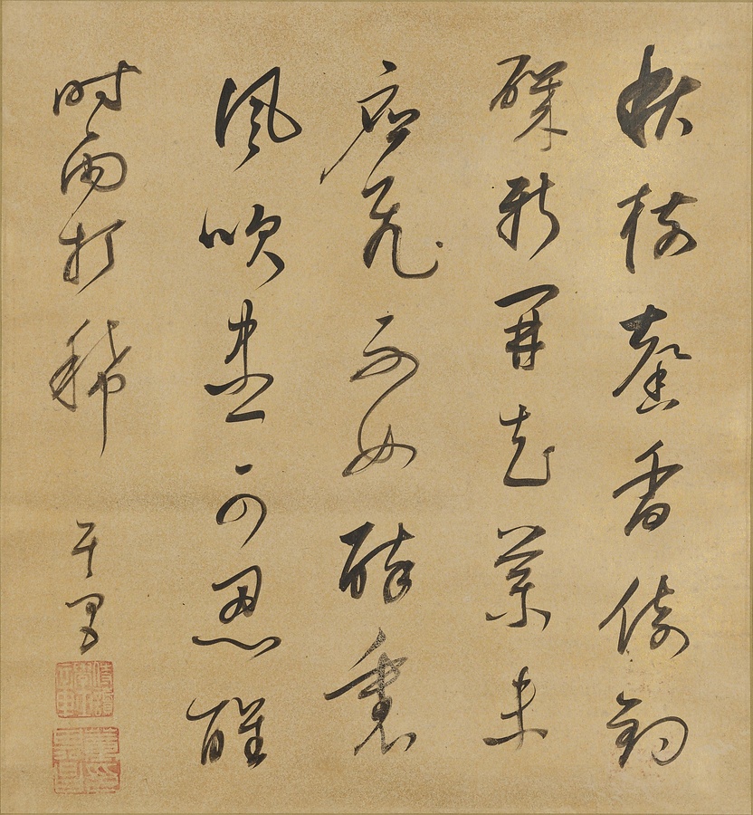 銘文:秋樹馨香倚釣磯、新開花薬未応飛。不如酔裏風吹尽。可忍醒時雨打稀。其昌 ; 「侍読学士章」(白文方印) ; 「董印其昌」(白文方印)