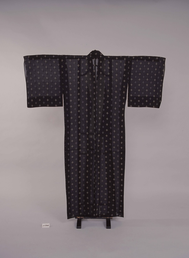 ドビー使用、黒地に白の線縞と白の十字絣手縫取