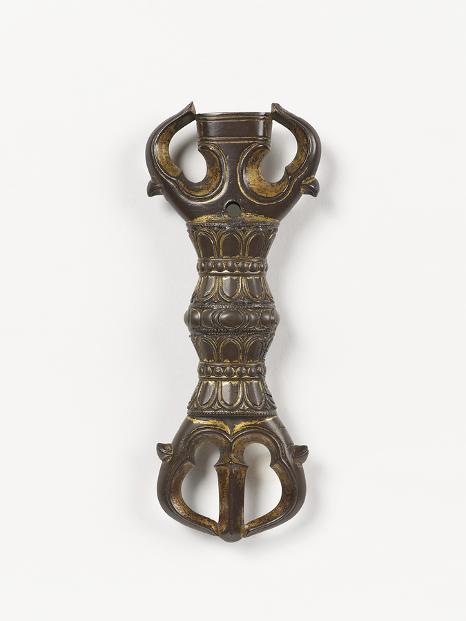 三鈷杵をかたどった、いわゆる聖柄のかたちをなす。上方の鈷部は、中鈷の代わりに剣の茎を挿し込むための受けをつくりだし、その基部には、茎を留めるための孔をひとつ開ける。脇鈷は逆刺を伴い中程で大きく屈曲するかたちをとり、鈷の側面に浅い樋を設ける。また、下方の柄頭側は脇鈷が中鈷に鋳付く。把部は中央に楕円形をなした二重の鬼目を設け、その上下には大ぶりな連珠を伴う鈕で約した間弁付きの二重花弁を巡らす。蘂は縦筋に細かく刻み、更に蘂頭には魚々子鏨を用いて細かい連珠を打ち回す。