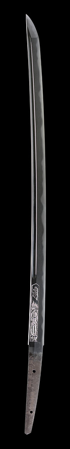 埋忠明寿(うめただみょうじゅ)は桃山時代から江戸初期にかけて京の西陣に住し、新刀鍛冶の祖と称せられた刀工である。また彼は彫金の技にも優れ、鐔(つば)や刀身彫刻には前時代にみられない華麗な斬新さがある。この太刀は反(そり)浅く、身幅やや広めに平肉つかず、鋒(きっさき)は延びて、一見大磨上(おおすりあげ)の刀を思わせるが、これは当時の長い太刀から短い打刀(うちがたな)への流行の変遷を示している。ただ表に櫃の中に不動明王像、裏に竜を浮彫にしているのは大磨上とは異なることを示している。銘文に見る「他江不可渡之」は自ら快心の作として子孫一門に与えたものであろう。明寿の作刀中、長いものは現存するものが少なく、正真と鑑せられるものは恐らくこの1刀のみであろう。