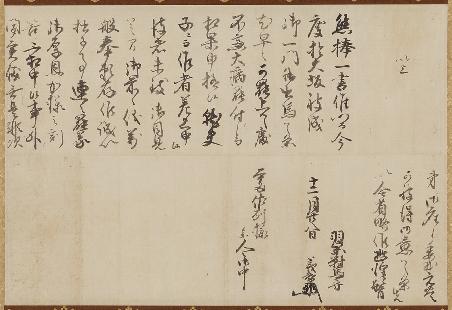 慶長19年(1614)12月28日付、本多正信(1538-1616)宛、宗義智(1568-1615)書状の案文。「大坂冬の陣」への出陣について、義智が大病を患い、参陣が叶わないため、子の義成(1604-1657)を参陣させたいが、義成はまだ家康・秀忠への御目見えが済んでいないため、家康の出頭人である正信に対して家康・秀忠への取り成しを依頼する内容である。文化13年(1816)に対馬藩が作成した「奥御判物長持之内ニ有之御書物写」(韓国国史編纂委員会保管)には、藩主の私物である「御判物長持」から「古キ御書物之内、考ニも可相成分」として本文書が書写されている。本文書は国外には流出せず、国内に留まったと見られる。近代以降に流出が進展した「宗家文書」を構成する史料である。