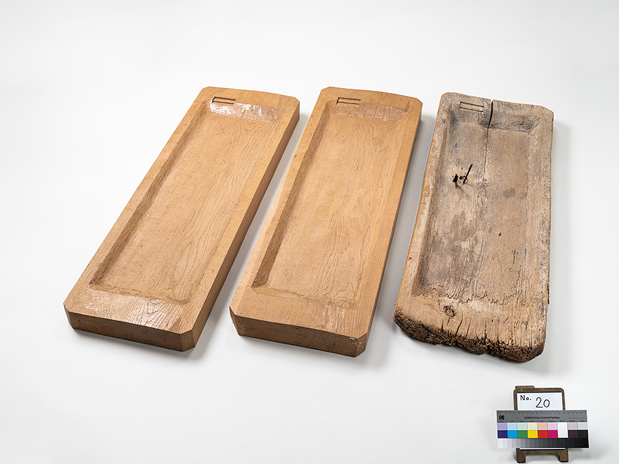 この台を傾斜させておき、そこにオヒキイタを置いて作業する。資料番号:4934(画像右)、5260(画像左)、5261(画像中央)